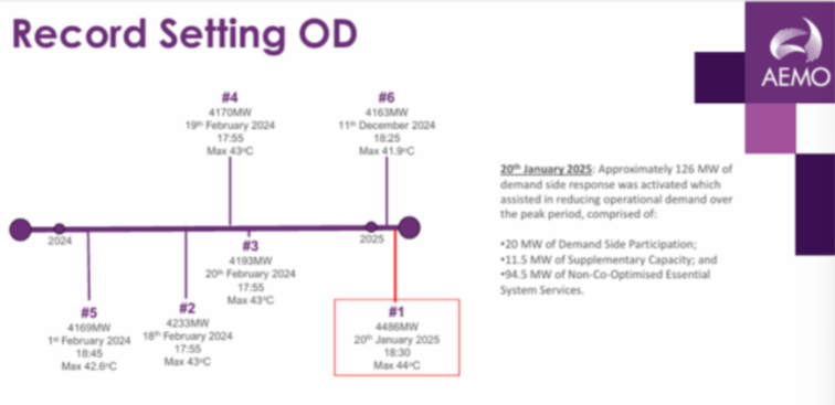 • Australia – Heatwave 20 Jan 2025: During WA’s 4,486 MW demand peak, AEMO activated 126 MW of demand-side response—20 MW DSP, 11.5 MW supplementary, and 94.5 MW ESS—helping avoid gas dispatch. Australian Energy Market Operator