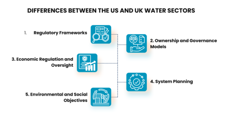 The US and UK differ notably in their regulatory frameworks. In the US, economic regulation typically happens at the state level through state public utility commissions, while environmental protection is overseen federally by agencies like the Environmental Protection Agency (EPA) under laws like the Clean Water Act.
